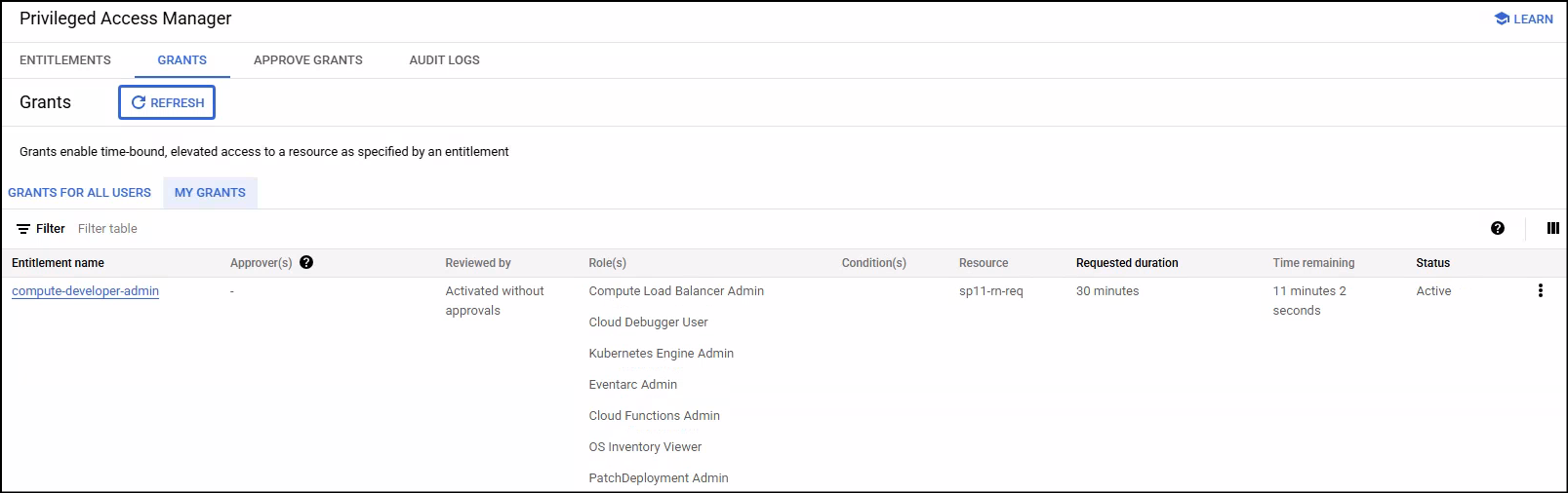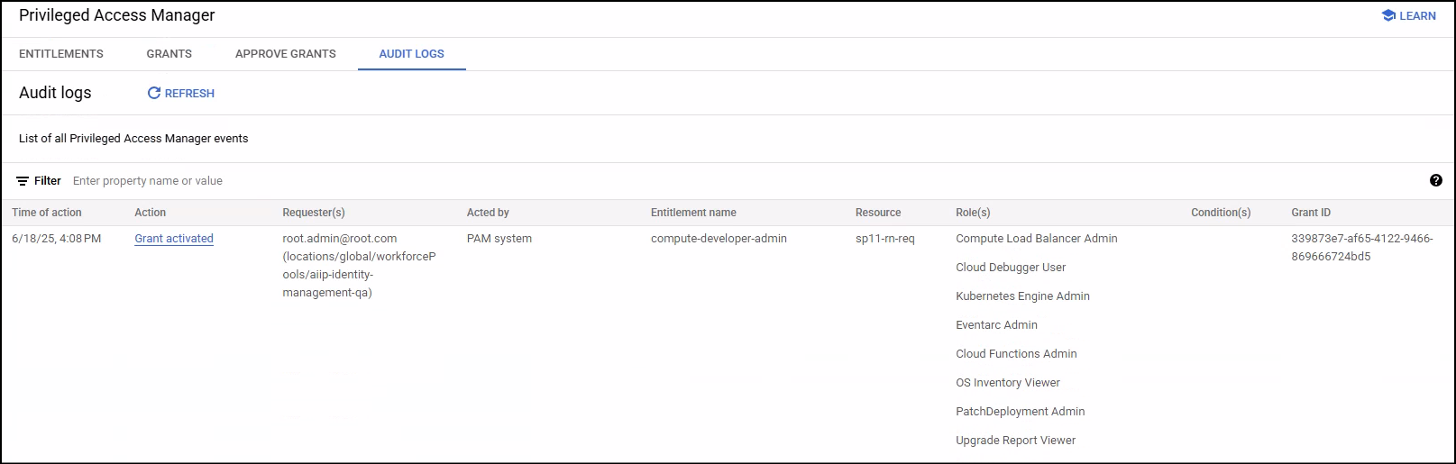 Once a grant is approved, PAM temporarily applies the specified IAM roles to the requester for the approved duration. All approval and denial actions are logged in Cloud Audit logs for compliance and tracking.
