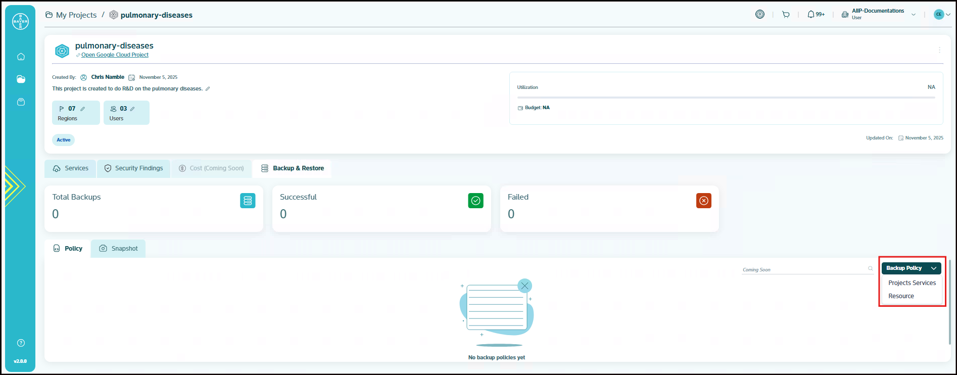 The backup policy is currently only available for "Compute engine", "Cloud composer", "Artifact registry" services. The restore functionality along with backup of all services and projects is planned for our upcoming releases.