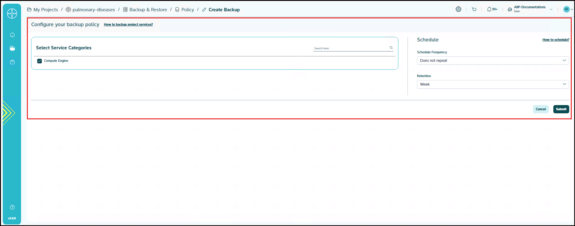 With the default service categories already selected, proceed to schedule the frequency and set the retention period. Then, click the "Submit" button at the bottom right of the page to enable your backup policy.