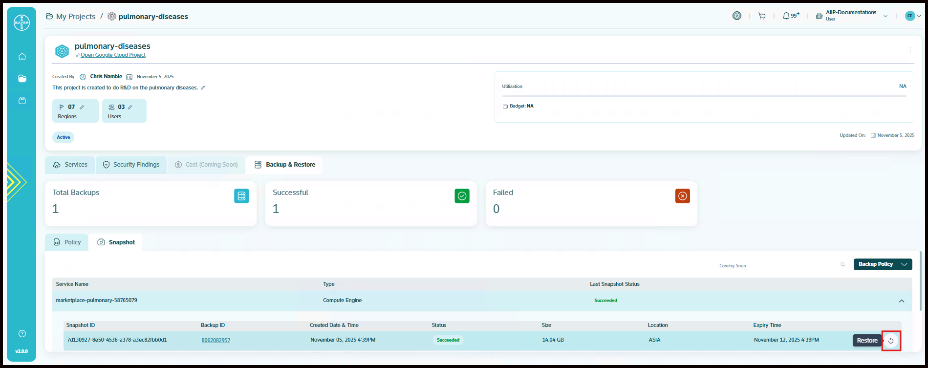 Currently we only have the backup functionality enabled for 3 of our services: "Compute engine", "Cloud composer", "Artifact registry". In the future releases, you will be able to backup and restore all available services from the service catalogue and also your projects as a whole.