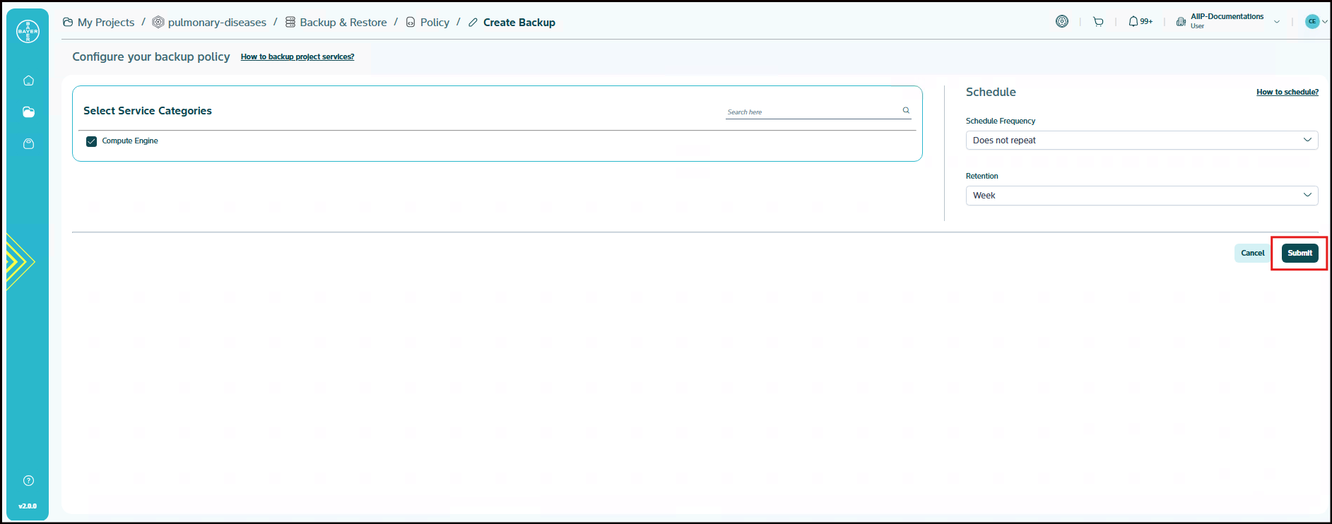 With the default service categories already selected, proceed to schedule the frequency and set the retention period. Then, click the "Submit" button at the bottom right of the page to enable your backup policy.