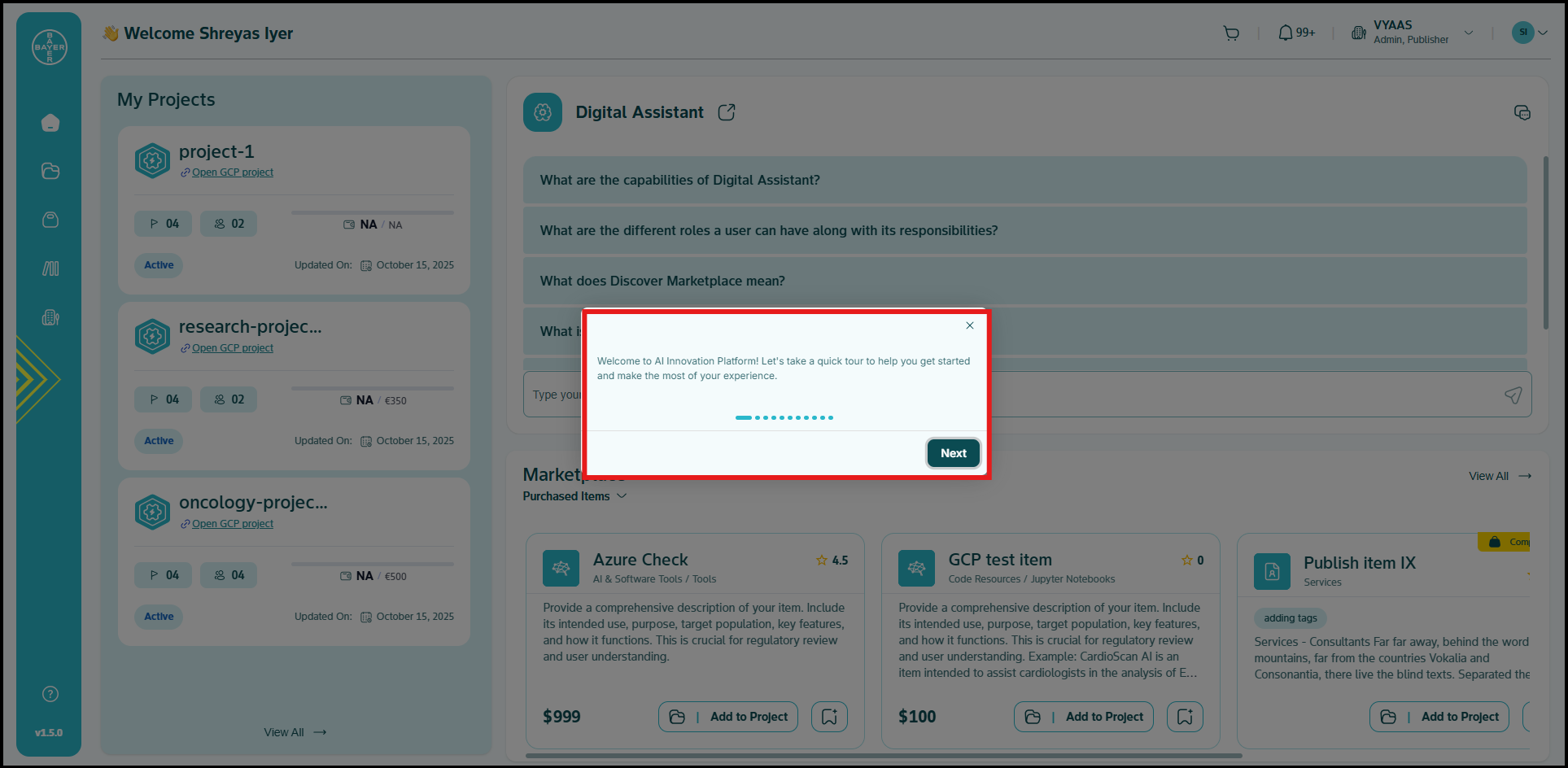 Version: The Version indicator displays the current release number of the AI Innovation Platform, providing you with essential system information. You can quickly identify which platform version you're working with, ensuring alignment with documentation and feature availability. Click here for more details.