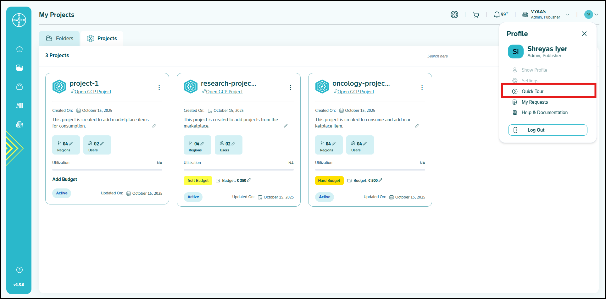 In case you are on another page (other than Dashboard) and want its tour, you can navigate to the "Quick tour" option and start the tour for that specific page. For example, if you want a walkthrough only for the My Projects page, navigate to the My Projects page, click on "Quick tour" option under your profile and start the tour of this specific page.