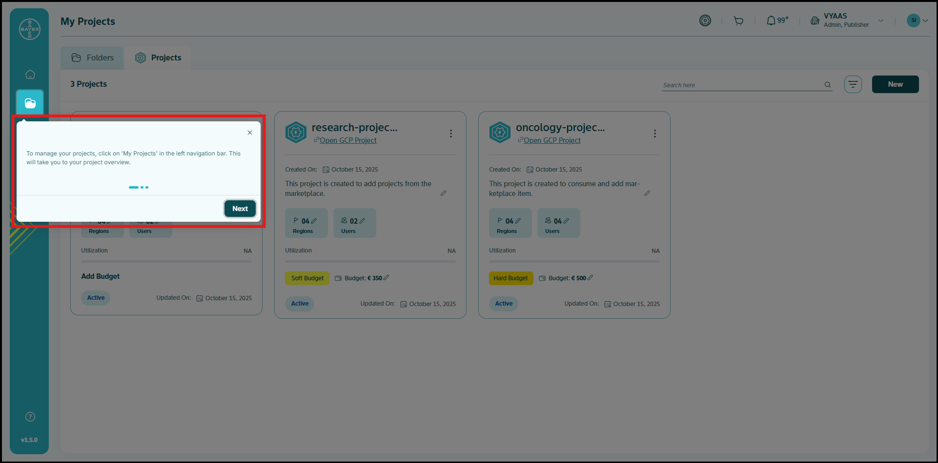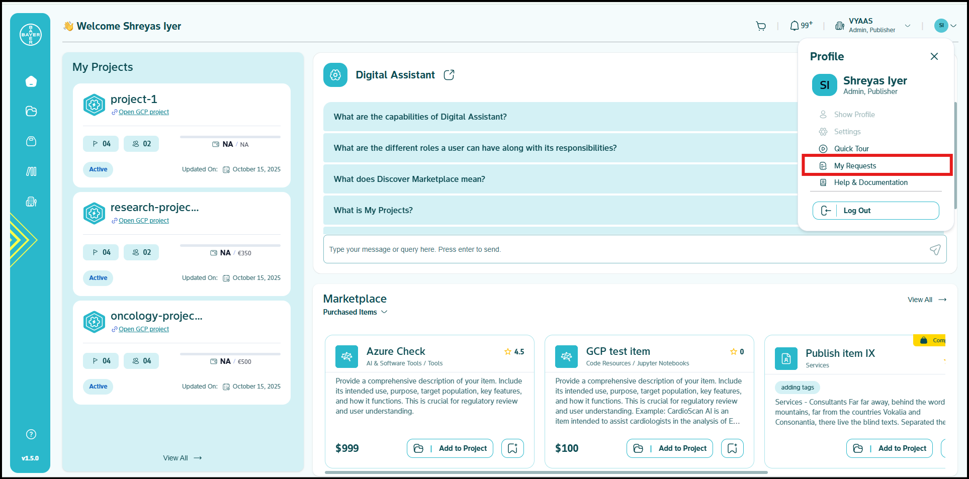My Projects: You can manage your individual projects, request new ones, and configure project-specific settings and resources. This is where you will oversee the development and deployment of your AI initiatives. Click here for more details.