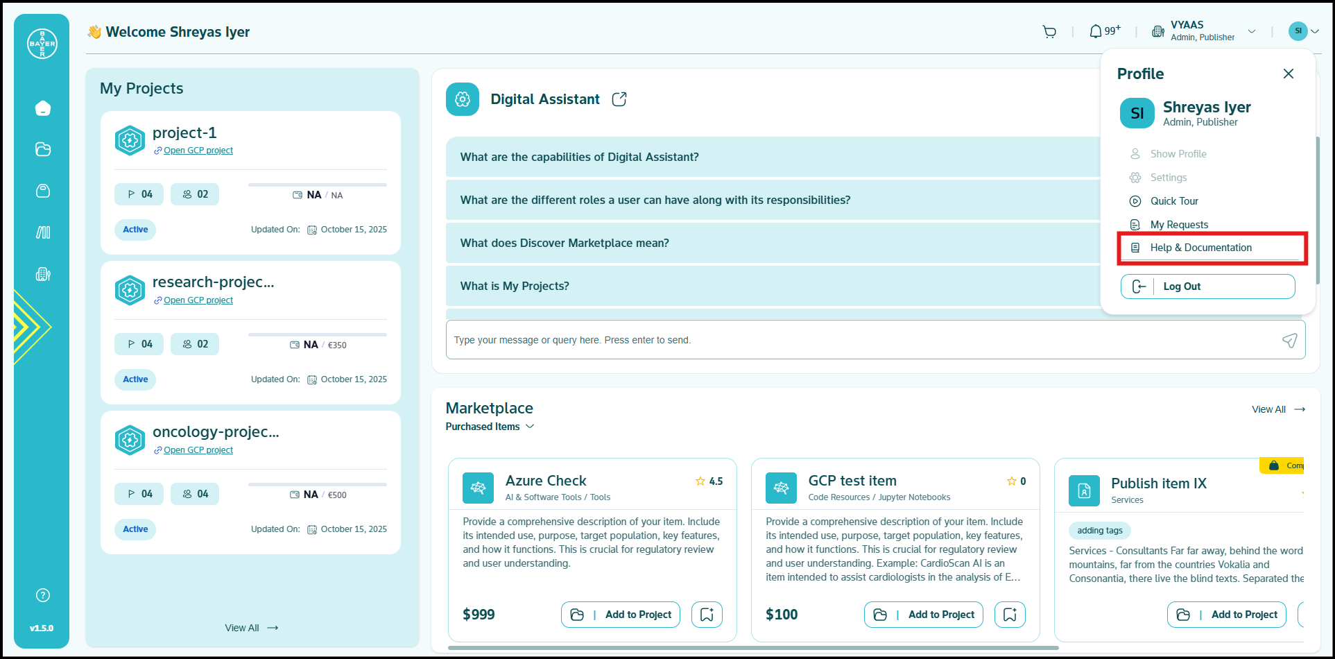 Dashboard: Your central hub for a summary of your projects, Marketplace items, and Digital Assistant.