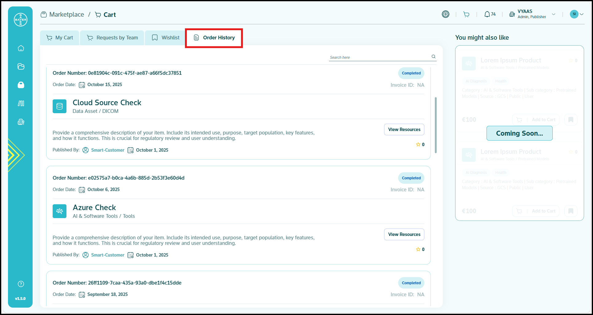 Once an order has been placed, it will be visible in your "Order History" tab inside the Shopping Cart. This shows all statuses of your purchased item. On clicking the entry, it takes you to the item's detailed view page.