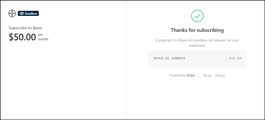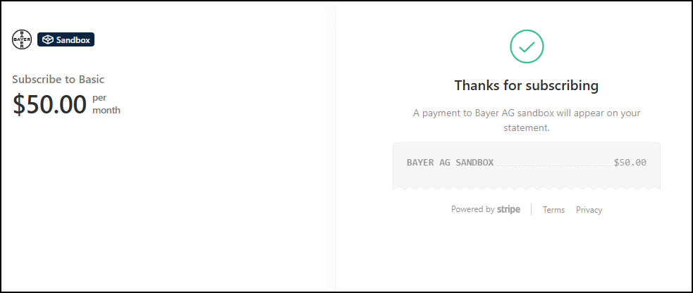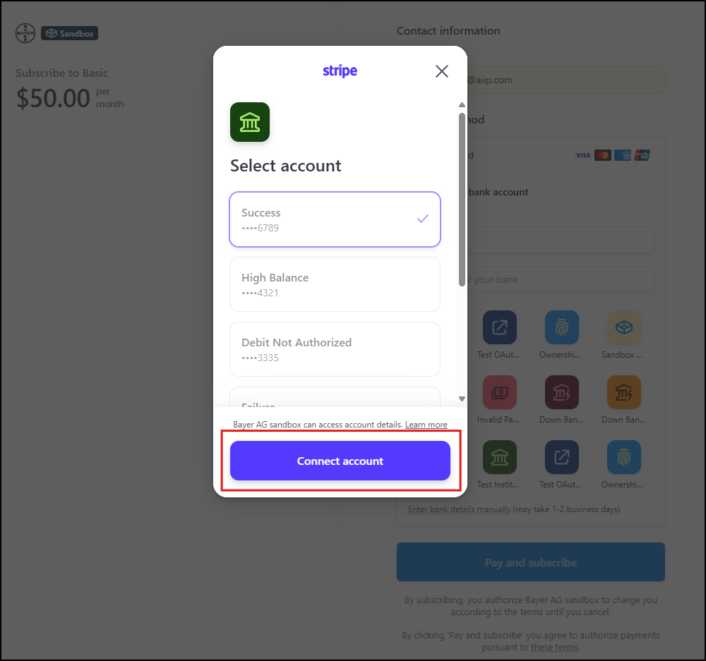 - Back on the Stripe checkout page, the Bank Account status will show "Success".