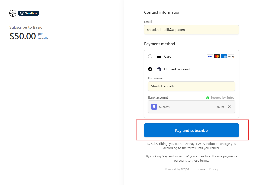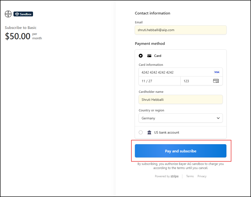 After entering card details, users click Pay and Subscribe to complete the transaction.