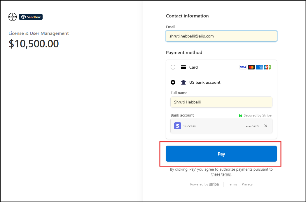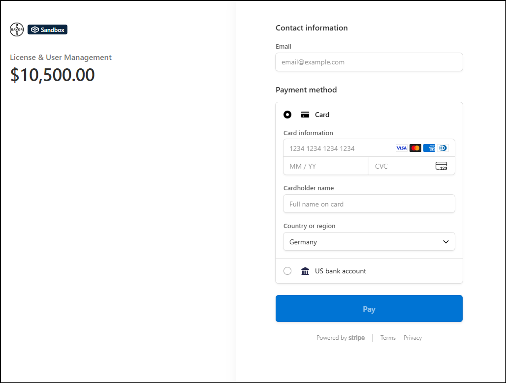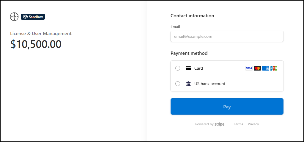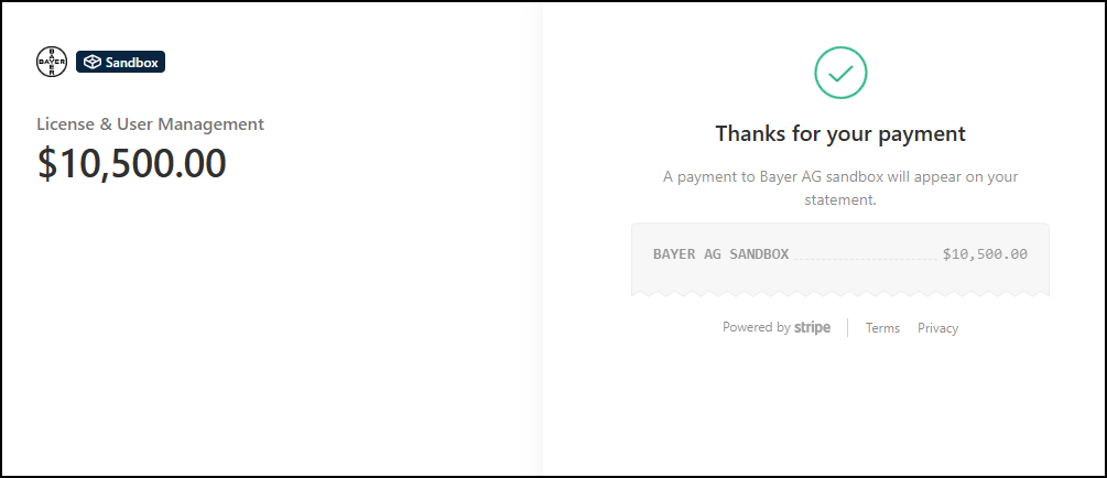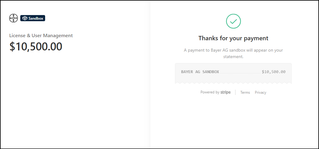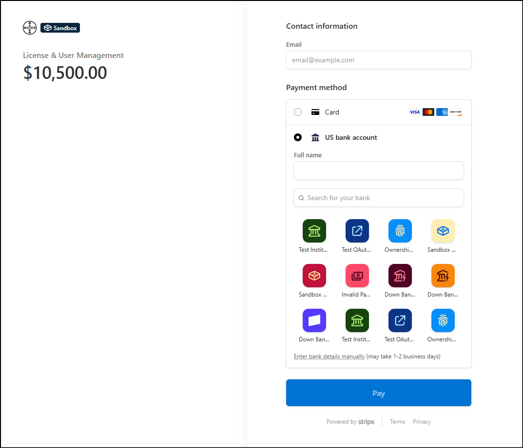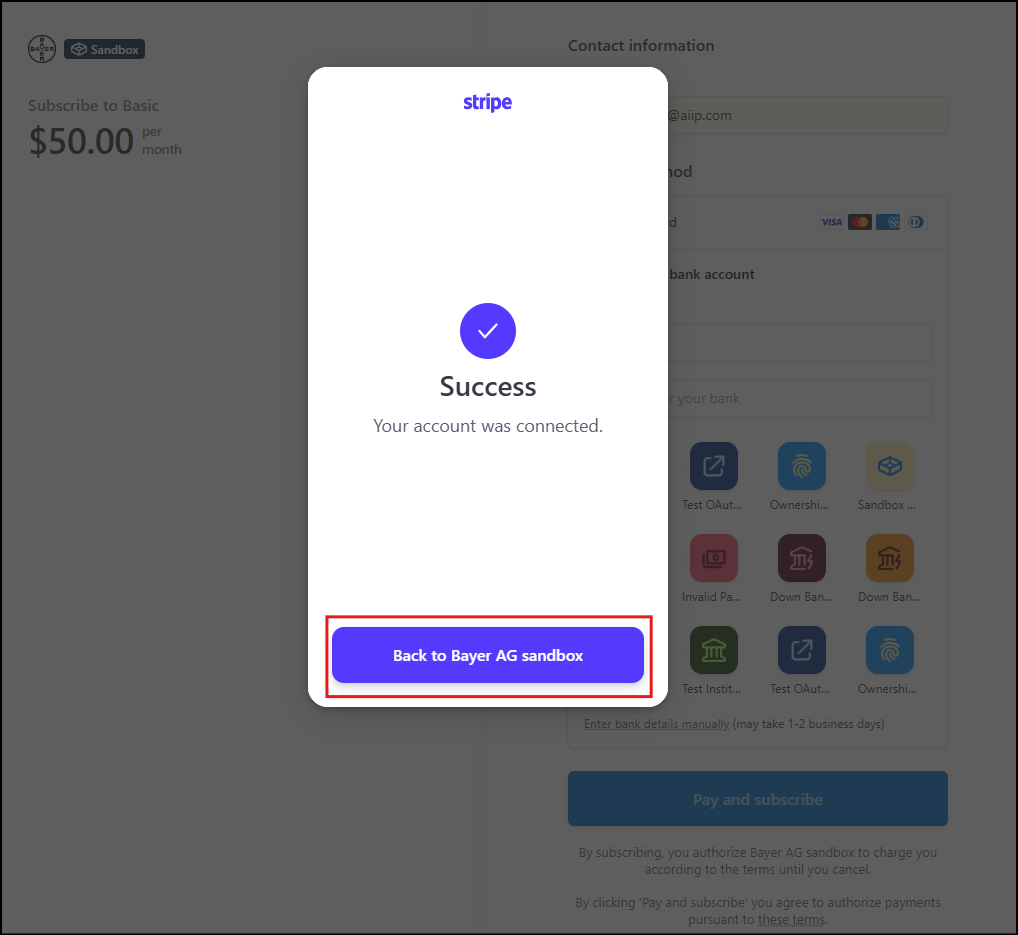 - Click Back to Bayer (or the relevant merchant name) to return to the Stripe-hosted checkout page.