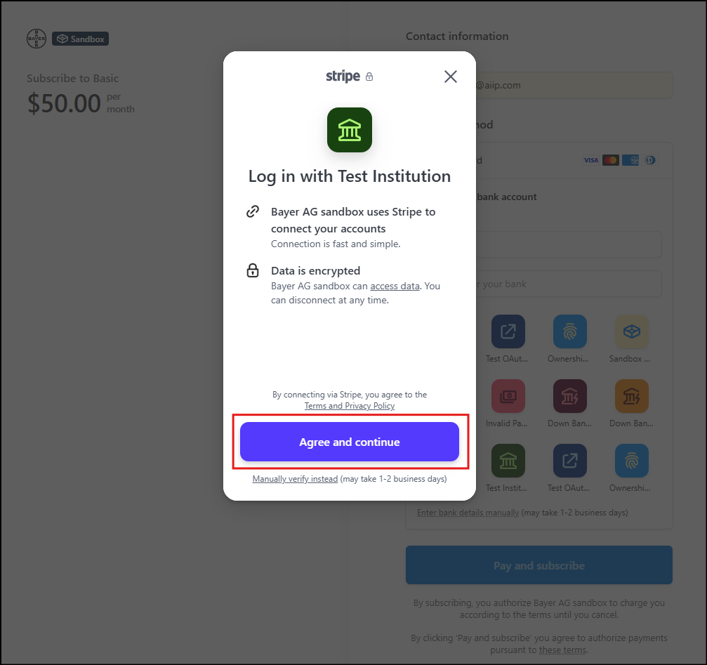 - Click Agree and Continue to authorize Stripe to initiate a secure connection with your bank.