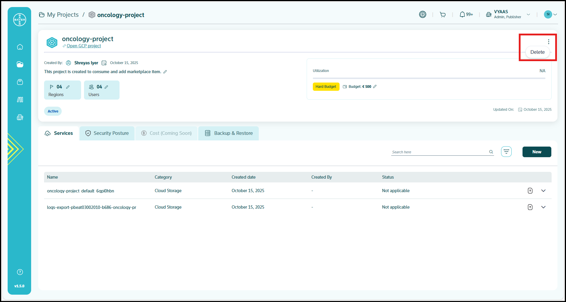 Navigate to the "My Projects" section and select the active project that you need to delete.