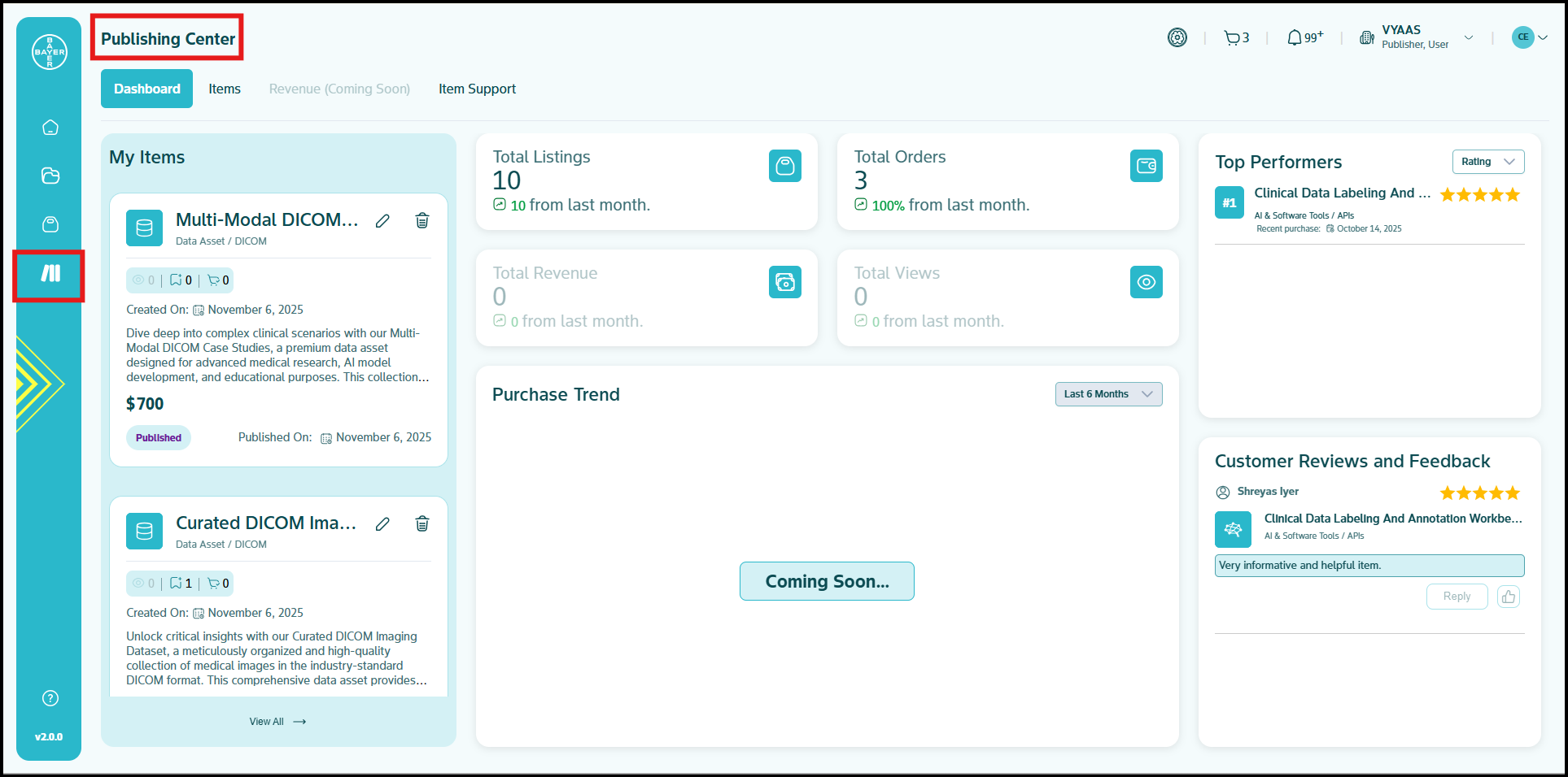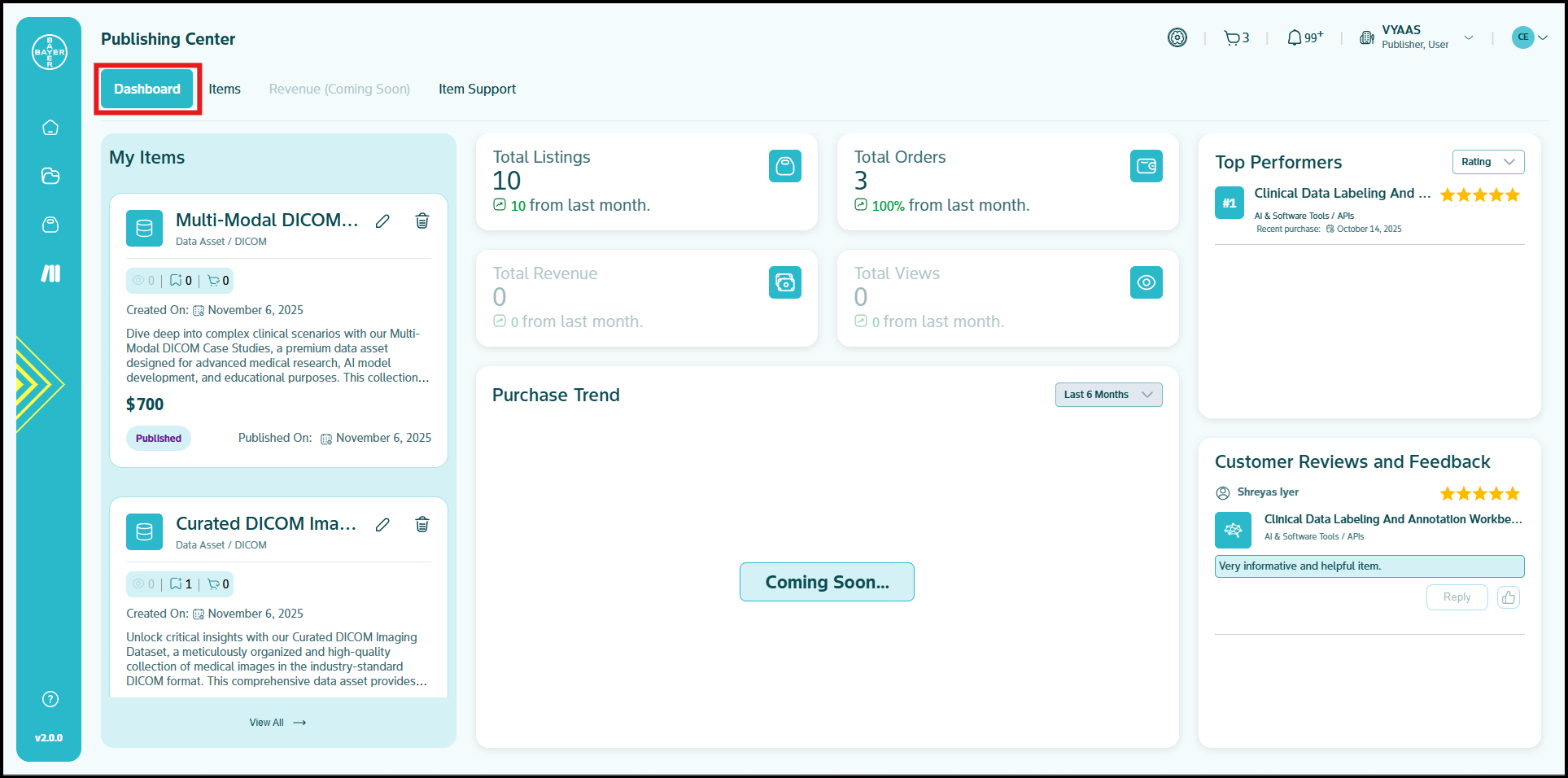 Dashboard: This serves as your central landing page, providing you with a quick and insightful overview of your publishing activity and the performance metrics of your items. It presents key analytics and visualizations to facilitate an immediate understanding of your success.