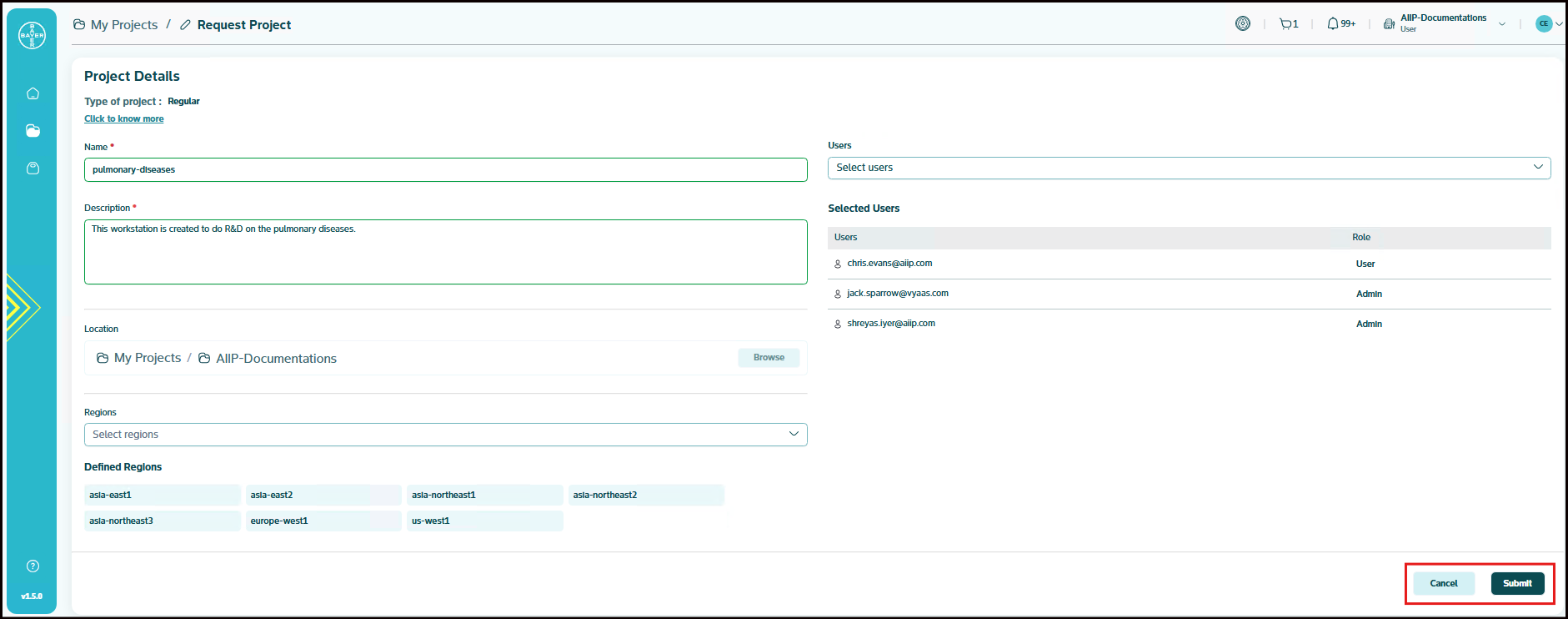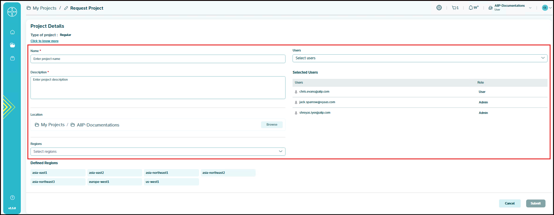 - Users (Optional): Both the folder's admin and you (as the requesting user) will be listed under the selected users list by default. You can select additional users from your tenant to make them part of your project