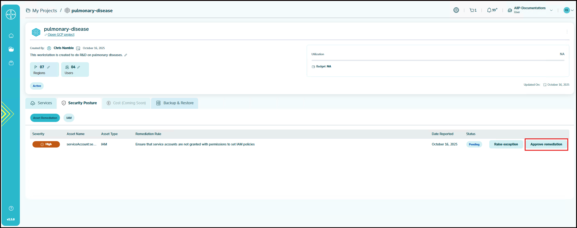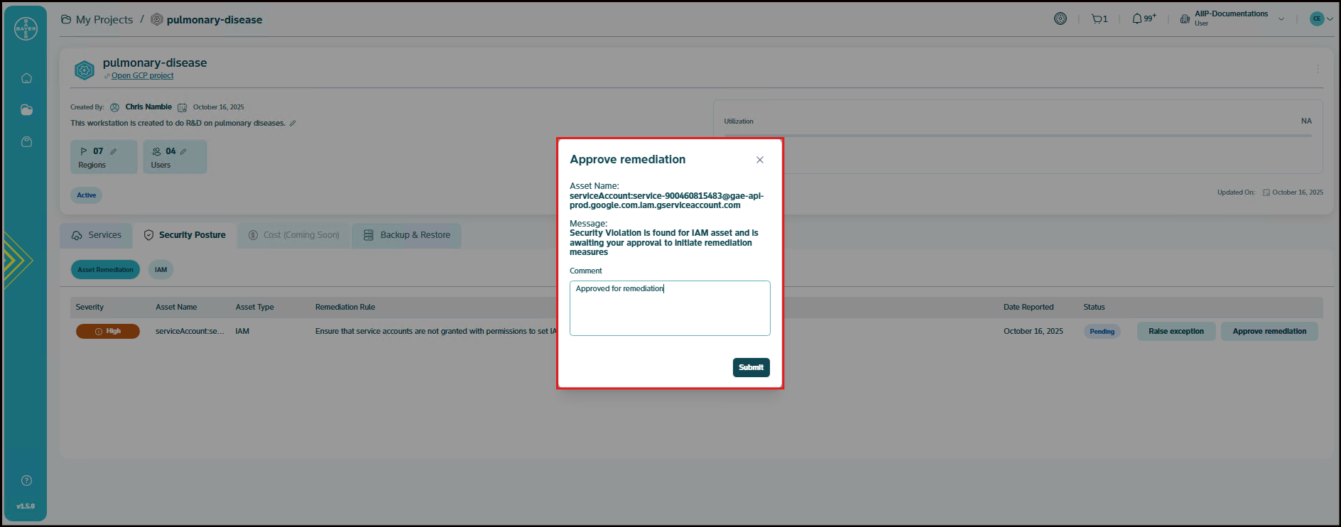 Select the finding from your security posture dashboard and click the "Approve Remediation" button.