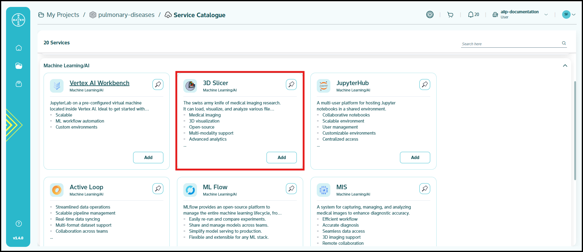 Machine Learning/AI: Tools and platforms supporting AI/ML model development, training, and visualization. This group includes Vertex AI Workbench, 3D Slicer, JupyterHub, MIS, Activeloop, Data service for MONAI, Deployable Package for DS and MLflow.