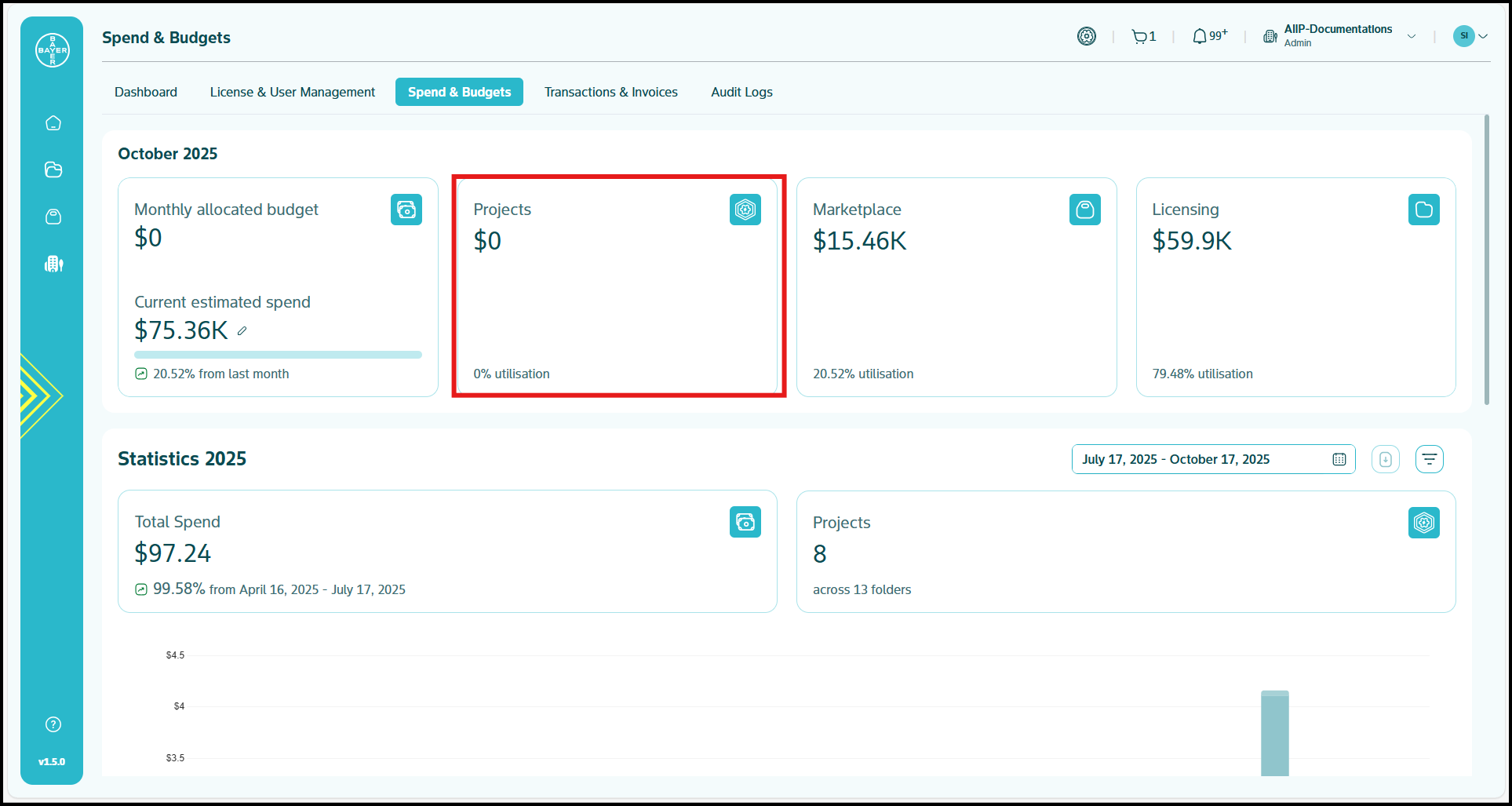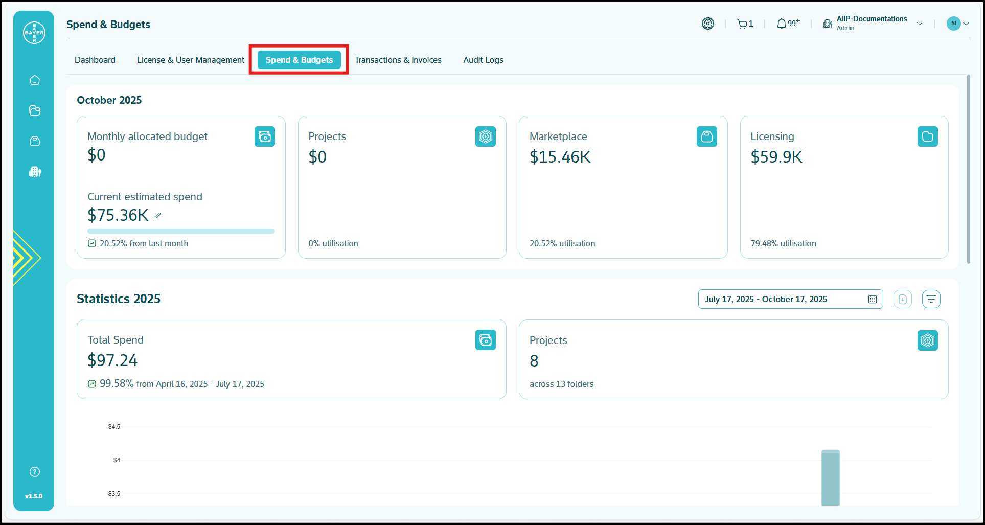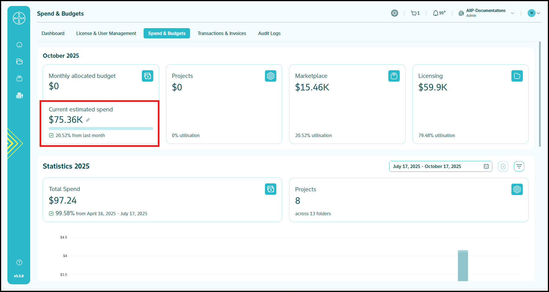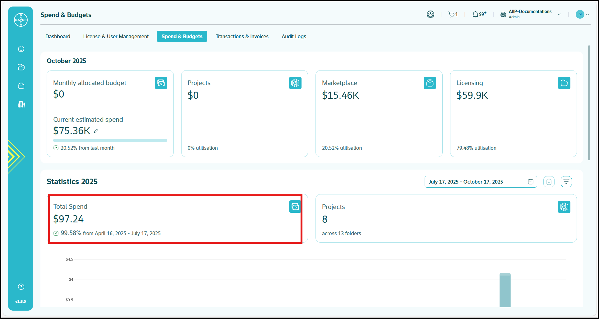 The Spend & Budgets section provides comprehensive financial oversight of your tenant's resource consumption across all platform services. This powerful Dashboard offers real-time visibility into your spending patterns, budget utilization, and resource allocation, enabling you to make informed decisions about your cloud investments.