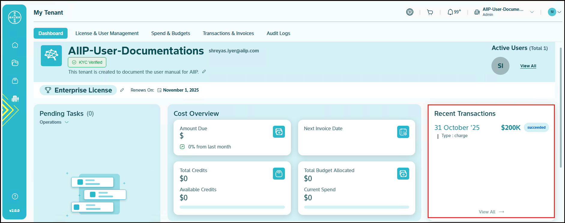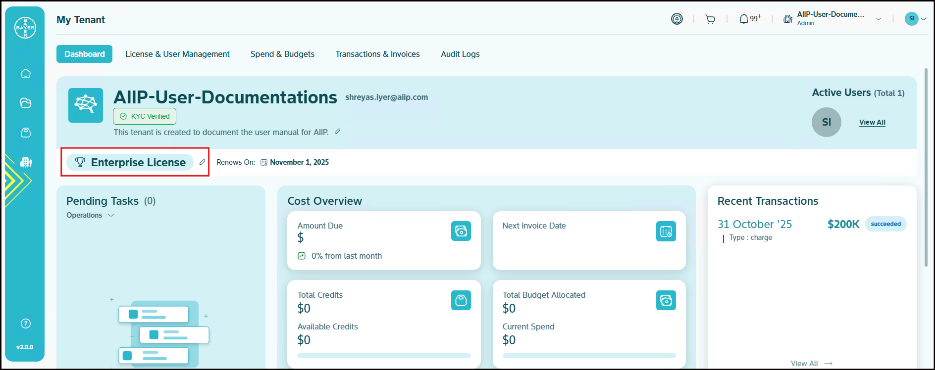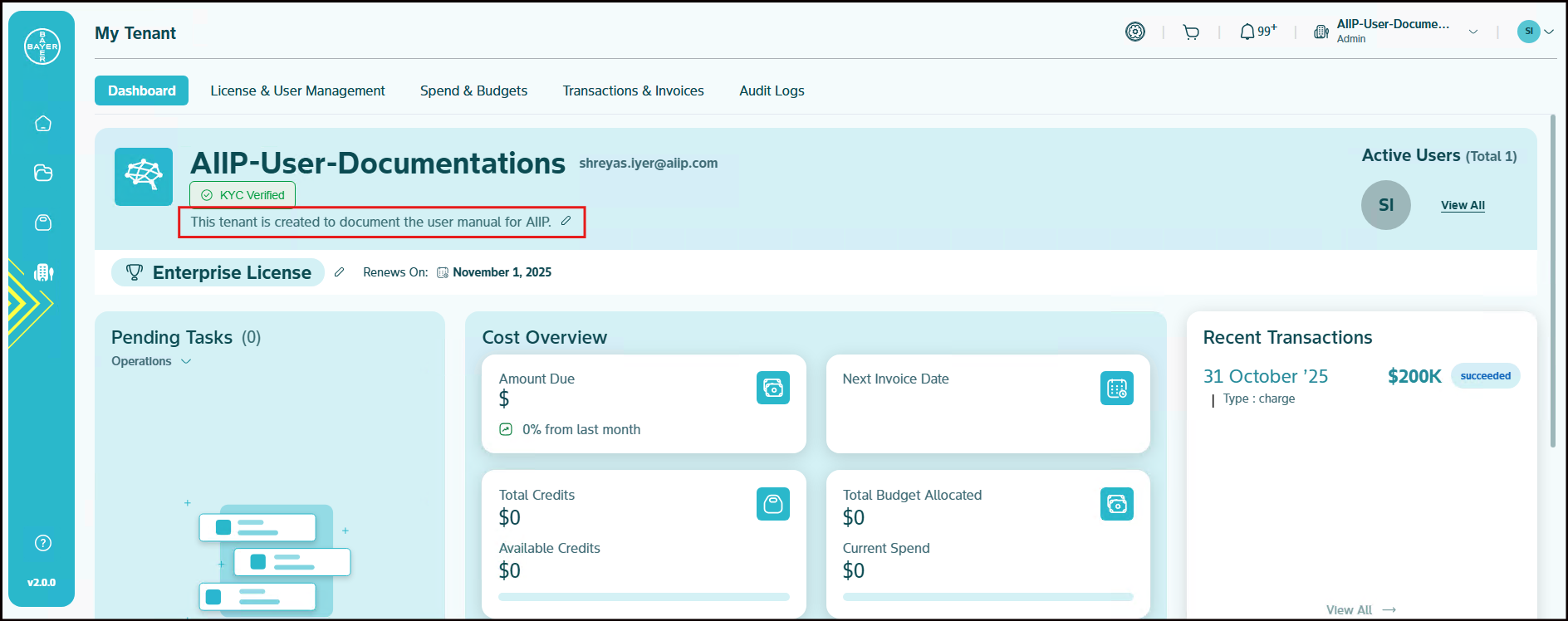 Your Tenants's profile displays key identification information including name, Tenant email ID, description, current license plan, active users, renewal date and logo. This area provides you with immediate recognition of your tenant environment and its core configuration.