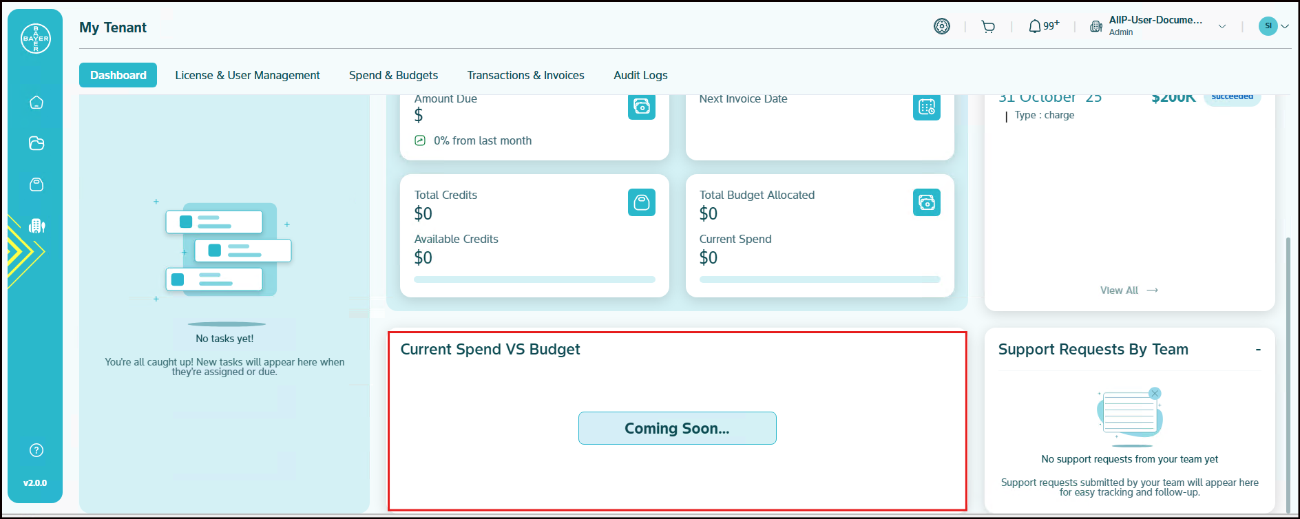 You can track your tenant's financial status through key metrics including current amount due, invoice date, available credits, budget utilization and current spends. The visual indicators provide you with immediate understanding of your financial position, complemented by information about your next invoice date.